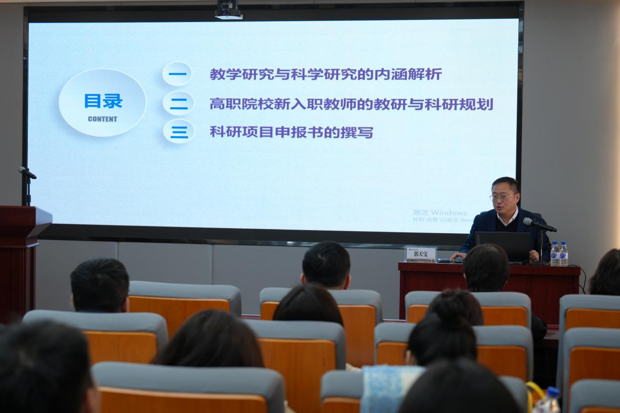 郭天宝教授以“中青年教师教研科研规划与能力提升”为题,围绕教学研究与科学研究的内涵解析、高职院校新入职教师的教研与科研规划等内容展开了深入、细致的讲授,同时以自身科研成长历程为范例,从论文发表、课题立项、撰写科研项目申报书等实操层面作详细讲解,助力中青年教师从理论高度、省域视角、评审维度加深对教科研工作的理解,帮助新入职教师明晰科研方向与规划路径。授课内容深入浅出、见解精辟独到且立意高远,具有极强的可操作性和指导性。